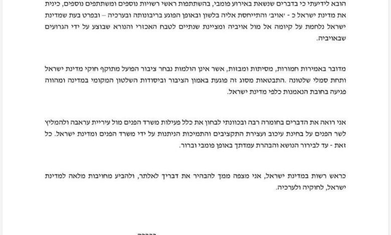 واختتم مدير عام وزارة الداخلية بالقول: “من غير المقبول أن يتحدث رئيس سلطة محلية في دولة إسرائيل بهذه الطريقة عن الدولة التي يمارس صلاحياته باسمها. إنها تصريحات تمسّ بثقة الجمهور وبأسس الحكم المحلي”.
