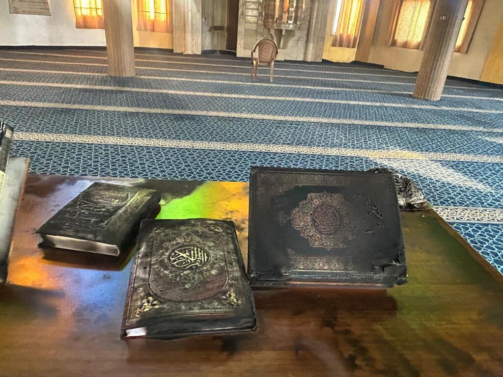 وقال الأهالي إن رائحة البنزين كانت واضحة في المكان، ما يدلّ على أن الحريق مفتعل ومخطط له مسبقًا، وقد تمكّن السكان من السيطرة على النيران قبل امتدادها إلى كامل مبنى المسجد.