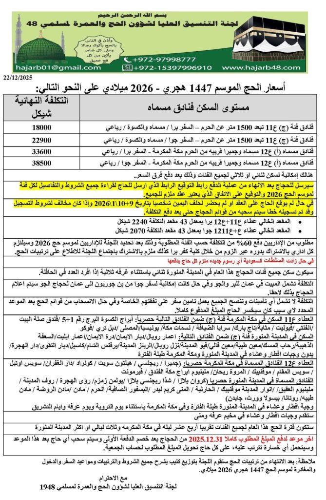 نشرت لجنة التنسيق العليا لشؤون الحج والعمرة لمسلمي 48 لائحة التكلفة النهائية للحج لموسم 1447 هـ – 2026 م، حيث تبدأ الأسعار من 18 ألف شيكل وتصل حتى 38,500 شيكل بحسب فئة الفندق وطريقة السفر.