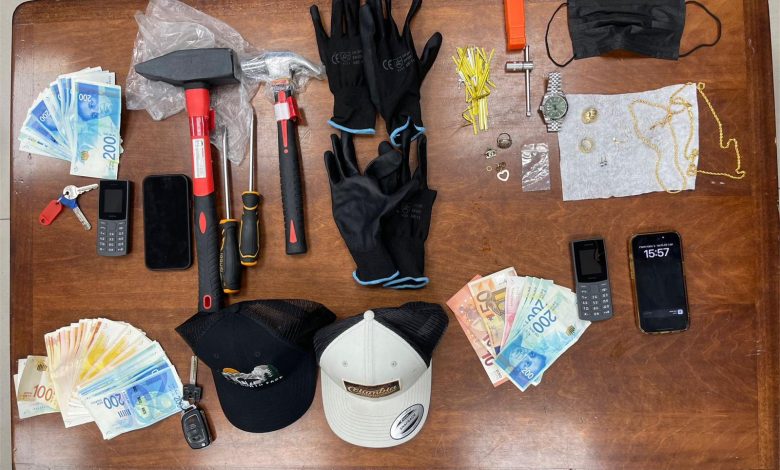 وأثناء تفتيش المشتبهين والمركبة، ضبط أفراد الشرطة نحو 8,000 شيكل نقدًا، ومجوهرات ذهبية وفضية من أنواع مختلفة، إلى جانب طقم ذكي ومتطور لاقتحام الأبواب، وأدوات عمل، وقفازات، وقبعات، وكمامات طبية، يُشتبه باستخدامها في تنفيذ عمليات الاقتحام.