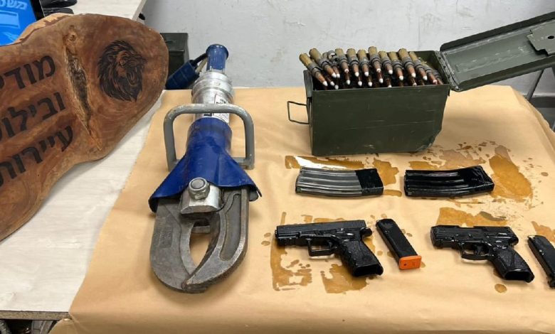 وأوضح بيان الشرطة أن التفتيش أسفر عن ضبط عدد كبير من وسائل قتالية، بينها: عبوة ناسفة تم التعامل معها من قبل خبراء المتفجرات، مسدس من نوع “غلوك” مع مشط ذخيرة، مسدس من نوع “تاوروس” مع مشط ذخيرة، صندوق ذخيرة بعيار 0.5 ملم، مخازن ذخيرة من نوع M16، وقاطع هيدروليكي يُشتبه في كونه مسروقًا من سلطة الإطفاء والإنقاذ.